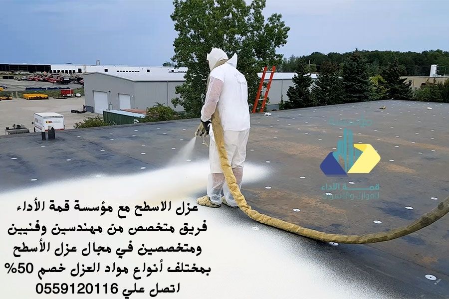 تطبيق المواد العازلة: يتم تطبيق المواد العازلة المناسبة على السطح بواسطة فريق شركة قمة الأداء. يتم استخدام تقنيات حديثة مثل الرش الحراري والعزل بالرغوة البولي يوريثان لضمان تغطية متساوية وعزل فعال.